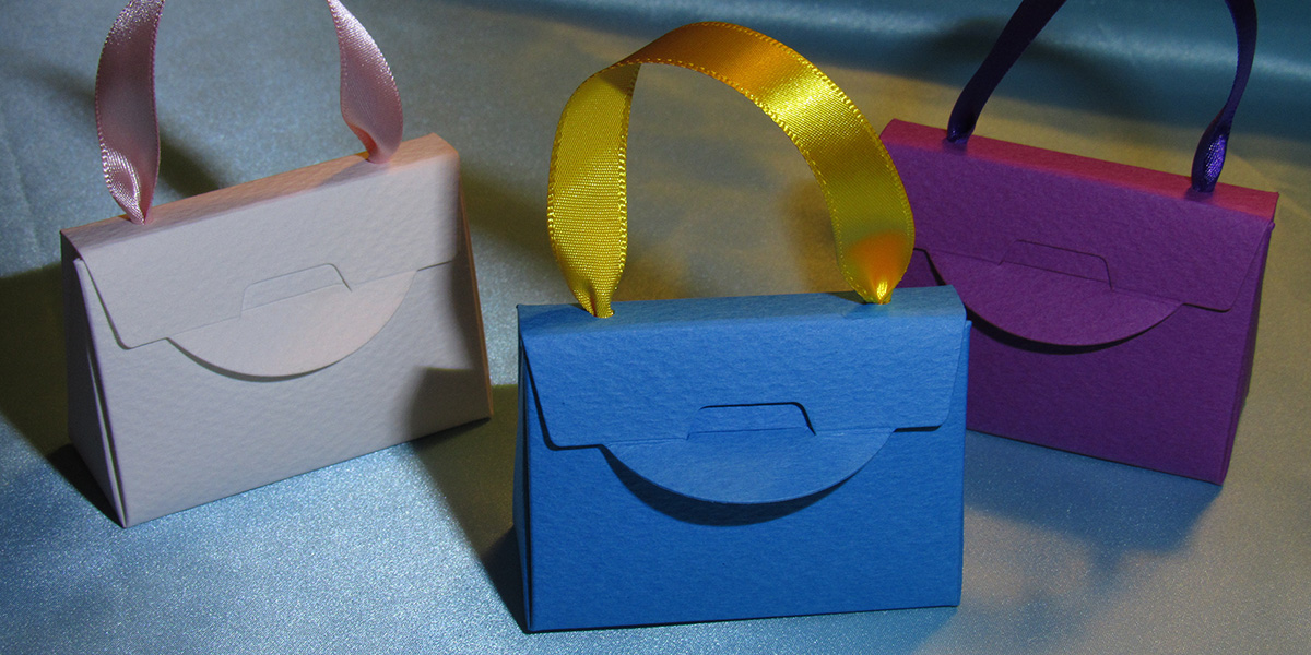 好きな色や素材のリボンでハンドル部を作り、箱はクラフト感漂う260kg厚の粗目の特殊紙、カラフルな五感紙を使用。その風合いが何ともいい味を出す。大きさはハンドル部を外して左右6cm×高さ5cm×厚み2cmほど。リボンを含む全高は7cmほどである。もちろんサイズはこちらもクライアントのご要望や商品の大きさによって対応可能である。