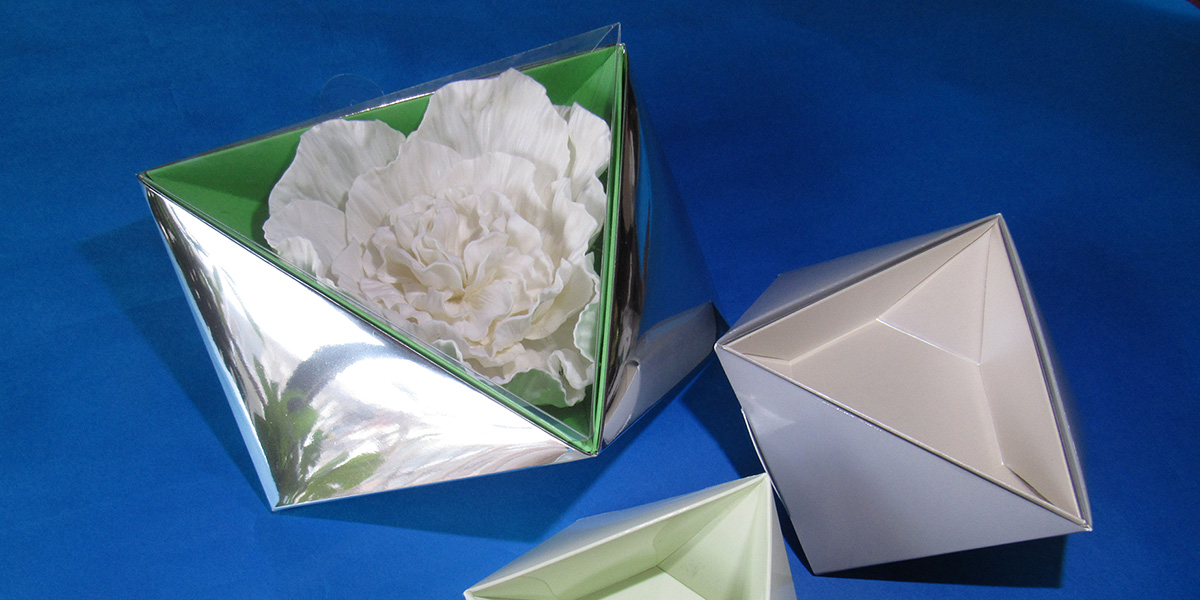 三角形の一辺は約10cmほど。多面の紙質をミラーコートのように、反射率の高い素材を選べば、中身のアイテムを万華鏡のように映り込ませ、より大きなハロー効果を演出する。上部の透明ペットフィルムの蓋は簡単に取り外しができるので、本来の商品を箱から出した後でも、壁掛けやディスプレイパッケージとして再利用できるのも嬉しい。