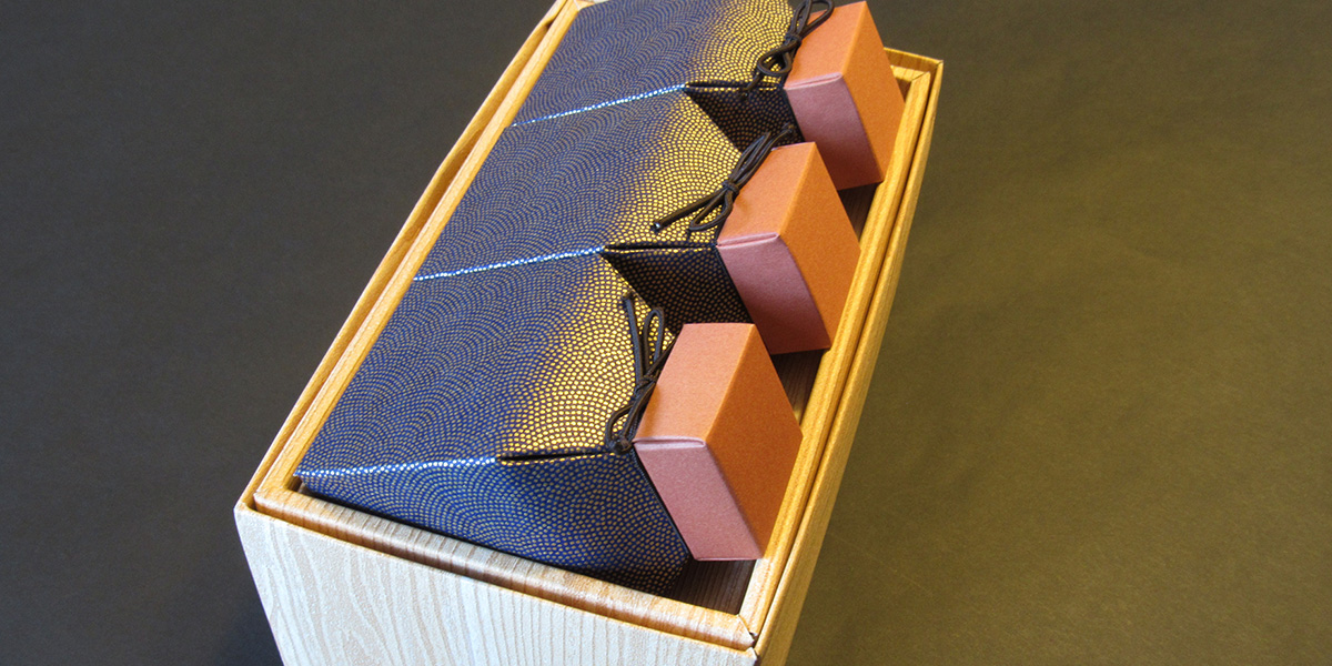 底側の箱の一辺は約5cm四方、厚さ2cmほどのこれまたスクエアな形の蓋を付け、紐で締めれば、まるでお茶壺のように見える古式ゆかしきフォㇽモのパッケージです。紐を解き上部の蓋を開けると、5cm四方の開口部が開き中の商品が見えます。もちろんお茶の商品であれば、その中に真空などでフィルムパックした商品が収まる想定です。
