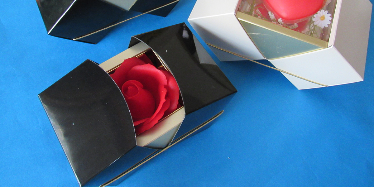 展示と収納が同時に機能するV字オープン型2WAYギフトパッケージ。カービングソープや、ブリザードフラワーなどアート性に高いギフト商品にはぴったりのパッケージです。